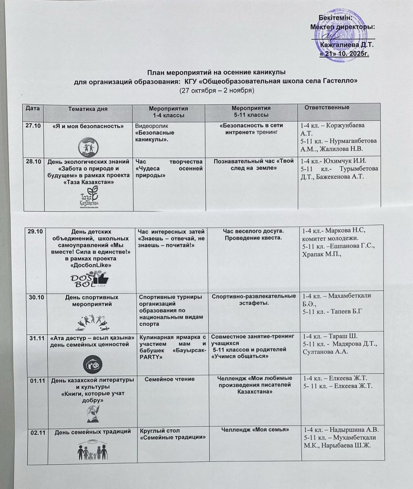 Мектептің күзгі каникул кезеңіне арналған жұмыс жоспары облыстық және аудандық білім бөлімі ұсынған әдістемелік нұсқаулар негізінде әзірленіп, бекітілді.